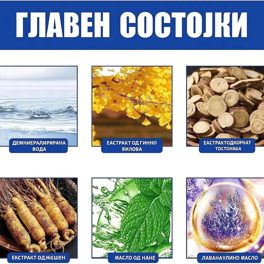 Состојки: прочистена вода, лист од гинко, сладок корен, женшен, масло од нане.
