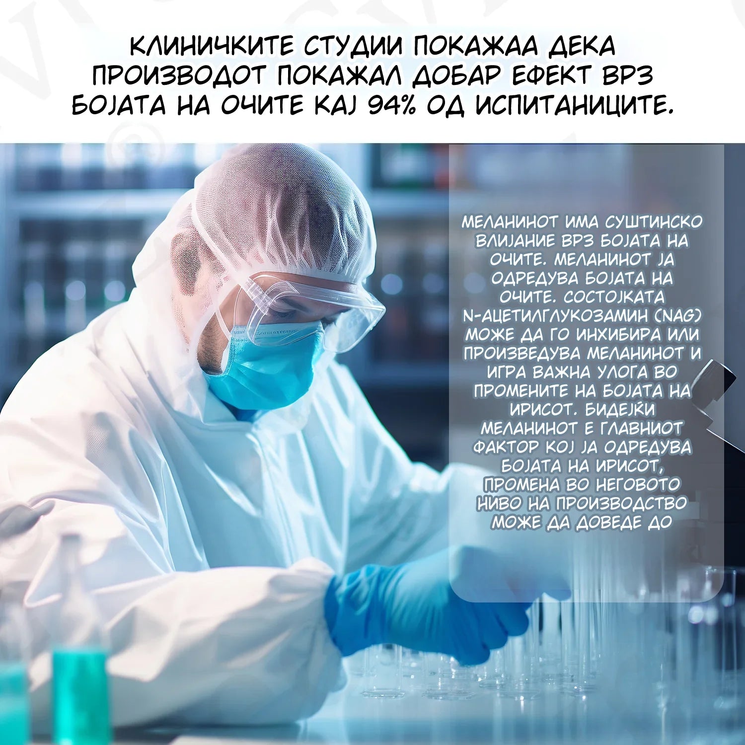 N-Ацетилглукозамин (NAG) – природен аминошеќер што делува врз меланинот и овозможува привремена, нежна промена во бојата на ирисот.