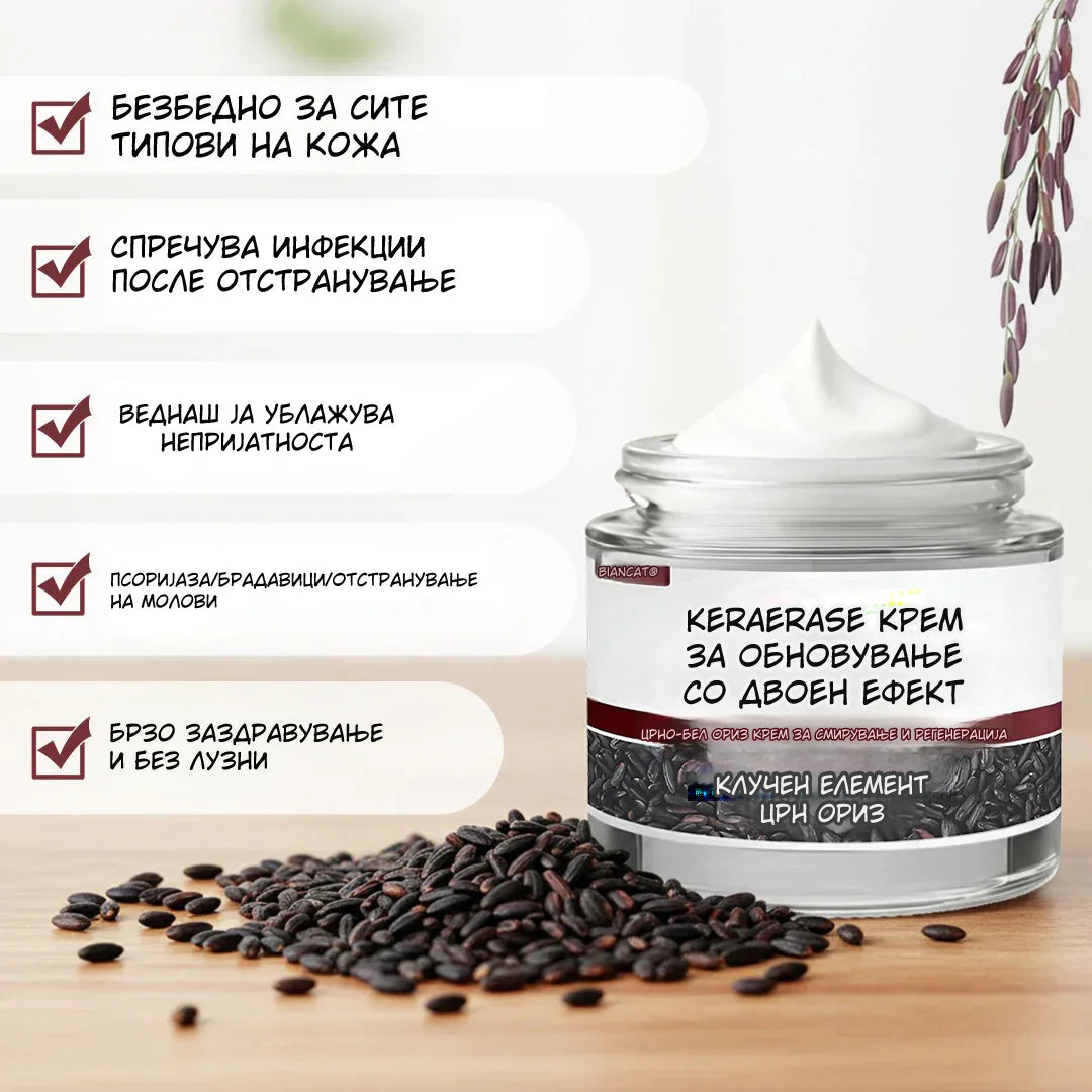Токму затоа го создадовме Biancat® KeraErase Dual-Action Renewal Cream – нежна формула на растителна база која ги омекнува испакнатините, го разградува длабоко насобраниот кератин и ги осветлува тврдокорните темни флеки – без киселини, печење, лупење или иритација.